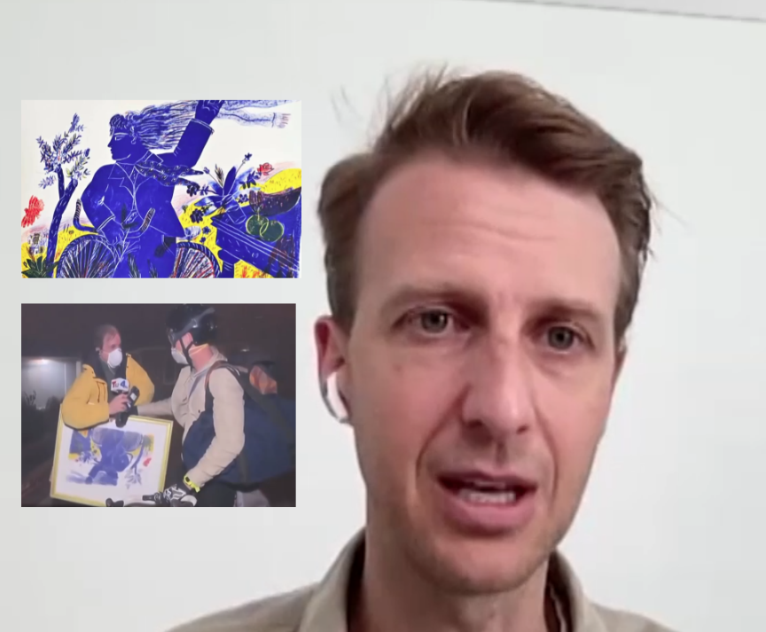 «Ήταν η πιο τρομακτική εικόνα που έχω δει ποτέ μου. Ήθελα απλά να φύγω και να σώσω την ζωή μου. Κουβαλούσα τους πίνακες. Ο άνεμος τους παρέσερνε. Θα έπεφτα από το ποδήλατο και μου είπε “μπορούμε να σε βοηθήσουμε κάπως;”. Και του απάντησα ότι θα εκτιμούσα, αν μπορούσε να πάρει τους πίνακες, γιατί εκείνη τη στιγμή το μόνο που σκεφτόμουν ήταν το πως θα φύγω από εκεί ζωντανός» ανέφερε μιλώντας στην ΕΡΤ.