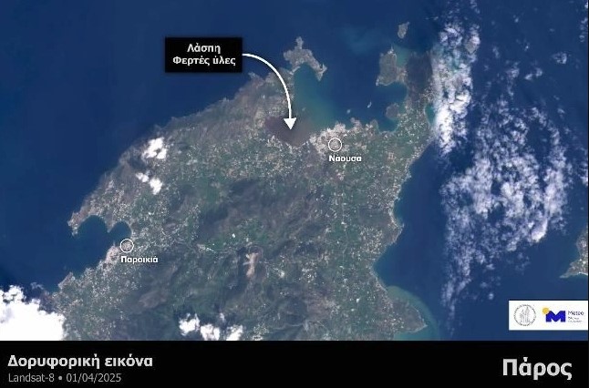 Στη δορυφορική εικόνα που κατέγραψε ο αμερικανικός δορυφόρος Landsat-8 και επεξεργάστηκε το Meteo του Εθνικού Αστεροσκοπείου Αθηνών, διακρίνεται η θαλάσσια περιοχή στη Νάουσα της Πάρου, όπου συγκεντρώθηκαν μεγάλες ποσότητες φερτών υλών και λάσπης, σημειώνοντας τις μεγαλύτερες ζημιές.