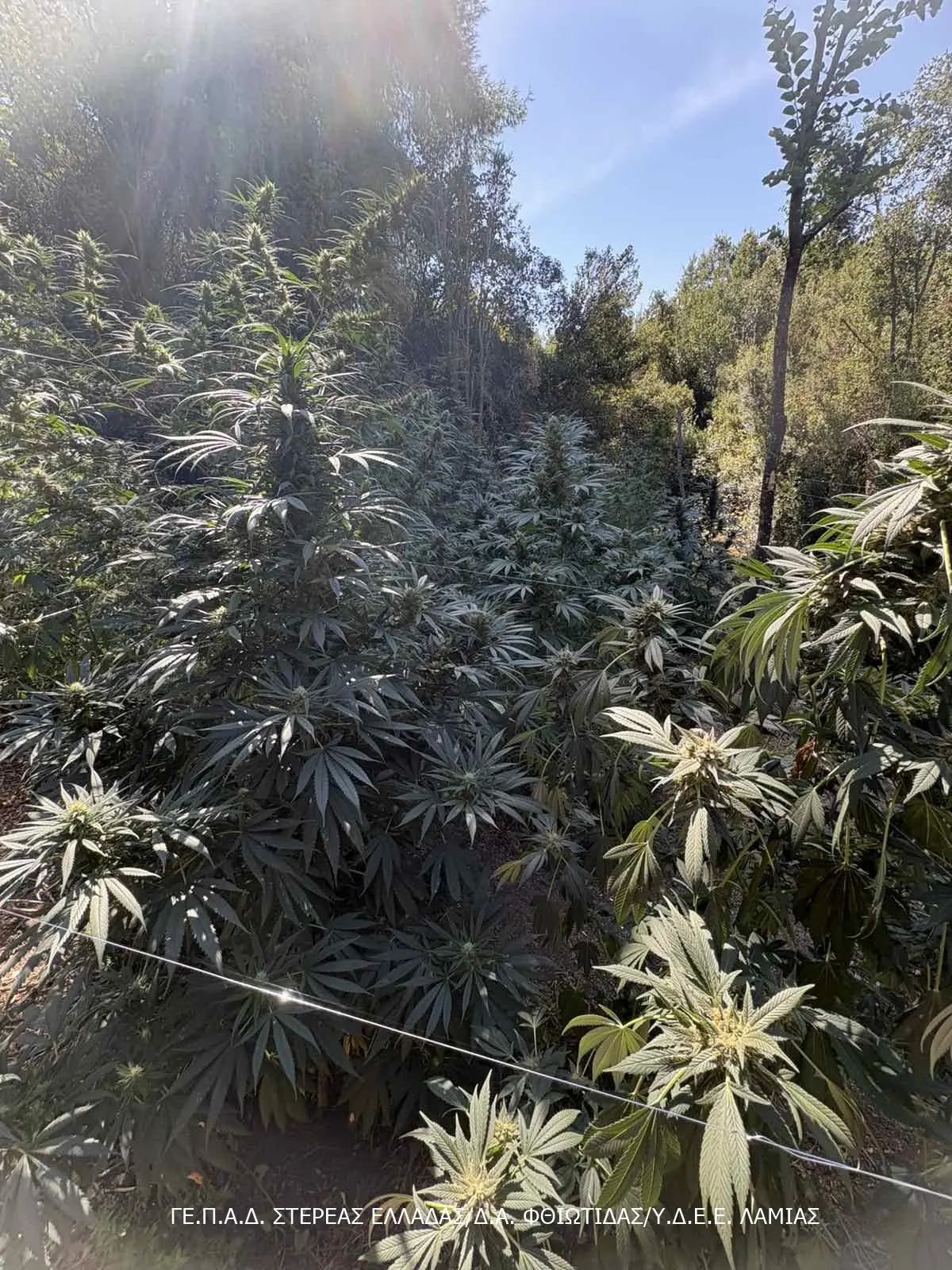 Φυτεία με συνολικά –23- δενδρύλλια κάνναβης, εντοπίστηκε σε δυσπρόσιτη αγροτική – δασική περιοχή της Φθιώτιδας. Η φυτεία εκτεινόταν σε ειδικά διαμορφωμένο χώρο, ο οποίος ήταν εκχερσωμένος και περιβαλλόταν από πυκνή και ψηλή βλάστηση (πουρνάρια και δένδρα),προκειμένου να της παρέχει φυσική κάλυψη και να είναι δύσκολος ο εντοπισμός της από τις Διωκτικές Αρχές.