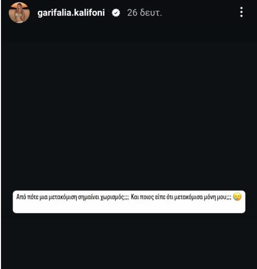 Η Γαρυφαλλιά Καληφώνη λοιπόν, θέλοντας να ξεκαθαρίσει τα πράγματα προχώρησε σε μια ανάρτηση γράφοντας, «Από πότε μια μετακόμιση σημαίνει χωρισμός; Και ποιός είπε ότι μετακόμισα μόνη μου».