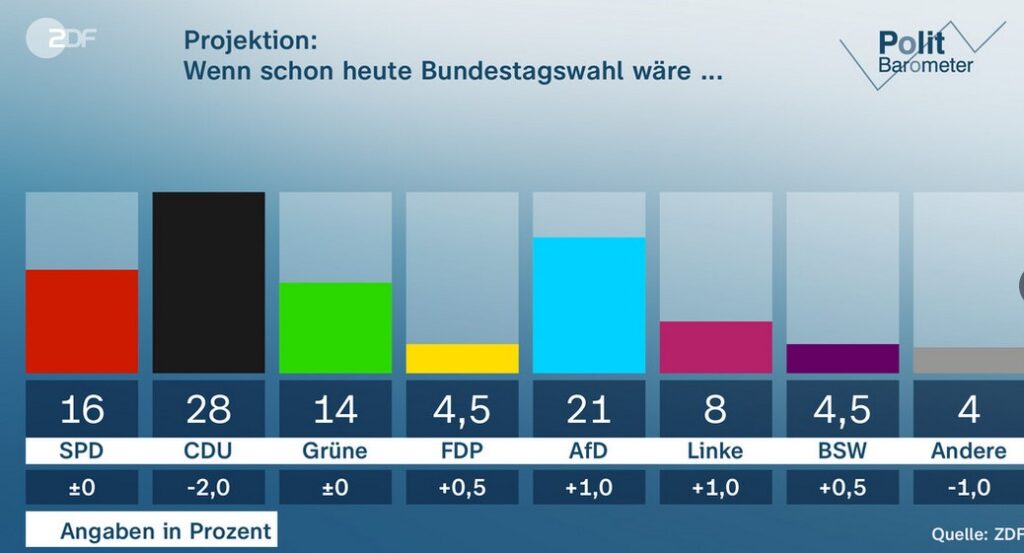 Σε άλλη δημοσκόπηση του Ινστιτούτου Wahlen για το ZDF, το CDU/CSU συγκεντρώνει 28% (-2%), το AfD 21% (+1%), το SPD 16%, οι Πράσινοι 14% και η Αριστερά 8%. Οι Φιλελεύθεροι (FDP) και το BSW κινούνται κάτω από το όριο εισόδου στη Βουλή (4,5%).