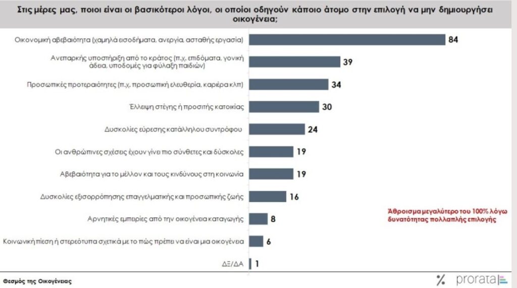 Στους βασικότερους λόγους που δεν μπορούν οι Έλληνες να προχωρήσουν στη δημιουργία οικογένειας αναφέρονται η οικονομική αβεβαιότητα (84%) η ανεπαρκής στήριξη του κράτους (39%) και οι προσωπικές προτεραιότητες (34%).