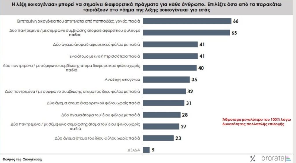 Για το 66% των ερωτηθέντων, οικογένεια είναι το παραδοσιακό πρότυπο με παππούδες, γονείς, παιδιά. Ωστόσο, ένα ίδιο ποσοστό 65% θεωρεί ως οικογένεια ακόμα και άτομα που μένουν με σύμφωνο συμβίωσης ή παντρεμένα που έχουν παιδιά.