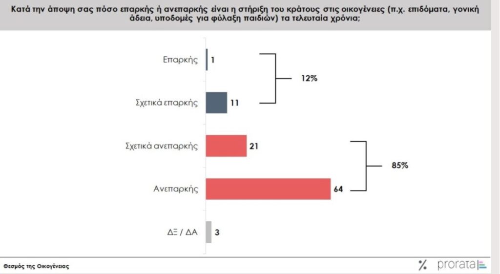 Ένα συντριπτικό ποσοστό των ερωτηθέντων (85%) θεωρεί το κράτος ανεπαρκές ως προς τη στήριξη των οικογενειών. Τόσο ο κ. Ζαφείρης όσο και ο κ. Αλεξίου παρατηρούν τις τεράστιες ευθύνες της πολιτείας, όπως καταγράφονται και από τις απαντήσεις των ερωτηθέντων.
