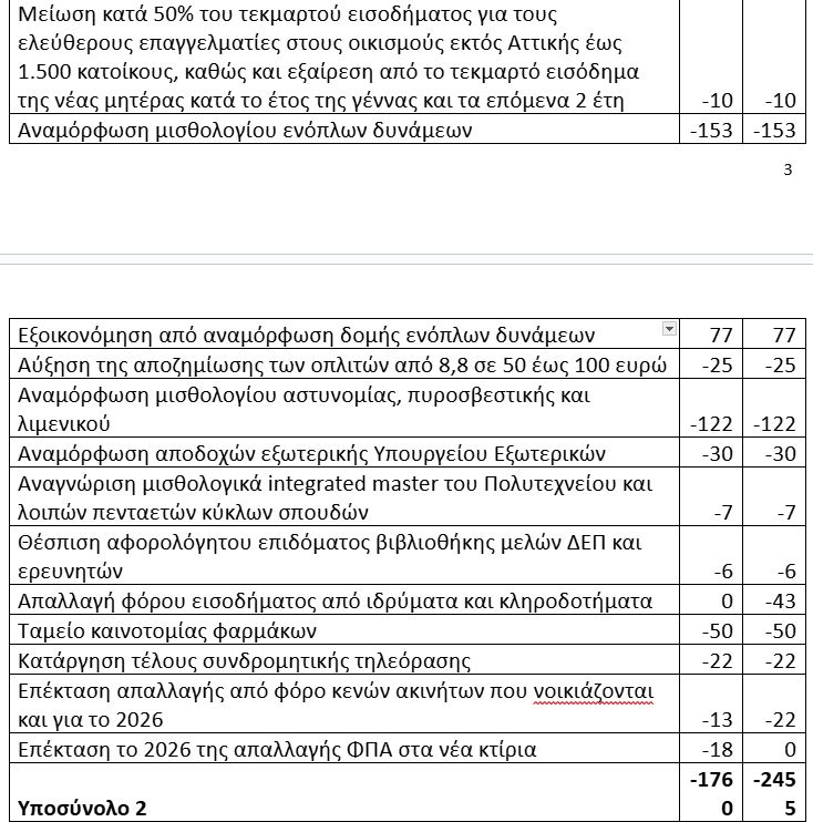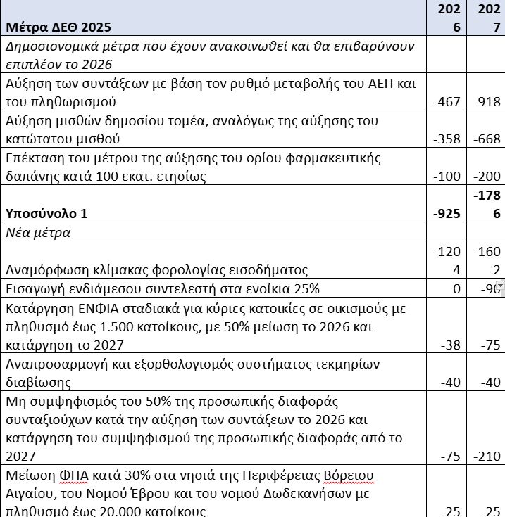 Στον πίνακα που ακολουθεί παρουσιάζεται το κόστος των βασικών δημοσιονομικών μέτρων για το 2026. Το συνολικό κόστος των μέτρων για το 2026, ανέρχεται σε 2,7 δισ. ευρώ, εκ των οποίων 925 εκατ. ευρώ αφορούν το κόστος μέτρων που έχουν ανακοινωθεί και 1,76 δισ. ευρώ νέα μέτρα. Επιπλέον, ορισμένα από τα νέα μέτρα (αναμόρφωση κλίμακας φορολογίας, μη συμψηφισμός προσωπικής διαφοράς συνταξιούχων, εισαγωγή ενδιάμεσου συντελεστή στη κλίμακα ενοικίων, κατάργηση ΕΝΦΑ για μικρούς οικισμούς, απαλλαγή φόρου ιδρυμάτων) έχουν επιπρόσθετη επίδραση για το 2027 ύψους περίπου 700 εκατ. ευρώ.