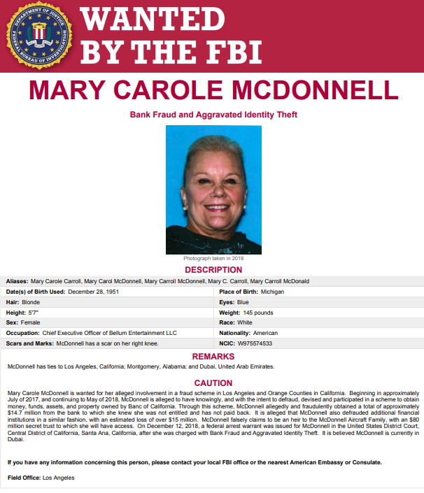 Το 2018, η McDonnell κατηγορήθηκε ομοσπονδιακά για απάτη 14,7 εκατομμυρίων δολαρίων σε βάρος της Banc of California, υποστηρίζοντας ψευδώς ότι είχε πρόσβαση σε οικογενειακό ταμείο. Η υπόθεση περιλάμβανε πλαστά έγγραφα και ψευδείς δηλώσεις ότι θα εξοφλούσε τα δάνεια από την περιουσία της. Σύμφωνα με ομοσπονδιακή εντολή σύλληψης, η McDonnell φέρεται να διέφυγε στο Ντουμπάι και παραμένει καταζητούμενη για απάτη και κλοπή ταυτότητας. Το FBI συνεχίζει να παρακολουθεί πληροφορίες για τις ενδεχόμενες παράνομες δραστηριότητές της στο εξωτερικό. «Η δημοσιότητα είναι εργαλείο έρευνας», δήλωσε η εκπρόσωπος του FBI, Λόρα Εϊμίλερ. «Η υπόθεση είχε αρχίσει να «παγώνει», αλλά νέες πληροφορίες υποδηλώνουν ότι η McDonnell συνεχίζει να εξαπατά, και αποφασίσαμε ότι ήταν στρατηγικά η σωστή στιγμή να γίνει γνωστή στο κοινό».