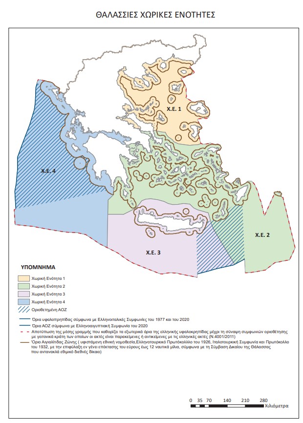 Ωστόσο η απάντηση της Αθήνας ήταν ηχηρή και άμεση, καθώς το πρωί της Μ. Τετάρτης, το Ελληνικό υπουργείο Εξωτερικών, ανακοίνωσε σε χάρτη τον ελληνικό θαλάσσιο χωροταξικό σχεδιασμό. Πρόκειται για μία σημαντική πρωτοβουλία, καθώς για πρώτη φορά η χώρα μας θέτει τους κανόνες για την οργάνωση του θαλάσσιου χώρου. Οι θαλάσσιες περιοχές που αποτυπώνονται στον χάρτη, συμπεριλαμβάνουν τις ελληνοϊταλικές συμφωνίες οριοθέτησης ΑΟΖ του 1977 και του 2020 και την ελληνοαιγυπτιακή συμφωνία του 2020, ενώ συμπίπτουν με τα όρια που απορρέουν από τον νόμο 4001/2011. Σε ό,τι αφορά μη οριοθετημένες περιοχές, αποτυπώνεται η μέση γραμμή που καθορίζει το εξωτερικό όριο της ελληνικής υφαλοκρηπίδας, μέχρι τη σύναψη συμφωνιών οριοθέτησης με γειτονικά κράτη, των οποίων οι ακτές είναι παρακείμενες ή αντικείμενες με τις ελληνικές ακτές.