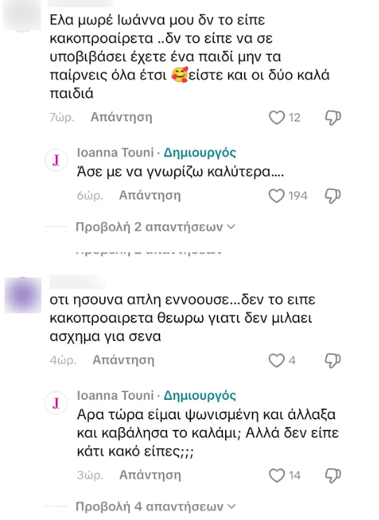Ωστόσο, το ξέσπασμα δεν έμεινε στο βίντεο καθαυτό. Η Ιωάννα Τούνη απάντησε σχεδόν σε όλα τα σχόλια που της έκαναν οι follower της στο TikTok, τονίζοντας μεταξύ άλλων: «Οι συγκαλυμμένες κακίες είναι οι χειρότερες θα πω εγώ. Να το παίζεις «καλός» ενώ θα έπρεπε να βρεις τρύπα να κρυφτείς μετά τις πράξεις σου… αλλά δεν βαριέσαι. Έχει και η υπομονή όρια… Άσε με να γνωρίζω καλύτερα. Με τις συνεντεύξεις που μου έστειλαν σήμερα τι να κάνω…» γράφει χωρίς κανέναν δισταγμό η Influencer και επιχειρηματίας, αναφερόμενη φυσικά στον Δημήτρη Αλεξάνδρου.