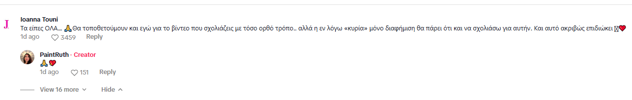 Κάτω από το βίντεο αυτό, σχολίασε η ίδια η Ιωάννα Τούνη γράφοντας, «Τα είπες ΟΛΑ… Θα τοποθετούμουν και εγώ για το βίντεο που σχολιάζεις με τόσο ορθό τρόπο.. αλλά η εν λόγω «κυρία» μόνο διαφήμιση θα πάρει ότι και να σχολιάσω για αυτήν. Και αυτό ακριβώς επιδιώκει».