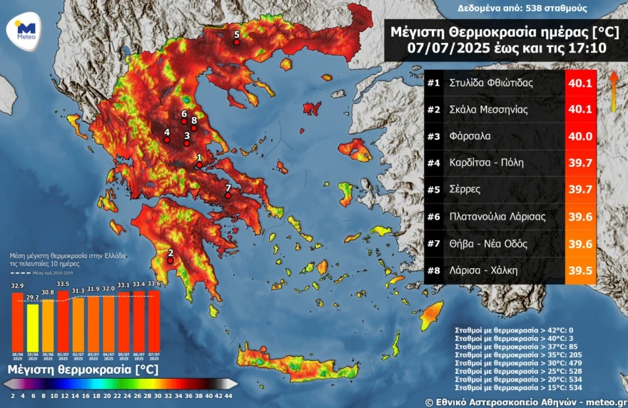 Όπως φαίνεται στον παρακάτω χάρτη, σύμφωνα με το δίκτυο αυτόματων μετεωρολογικών σταθμών του Εθνικού Αστεροσκοπείου Αθηνών / meteo.gr, 85 μετεωρολογικοί σταθμοί του δικτύου κατέγραψαν μέγιστες θερμοκρασίες άνω των 37°C.