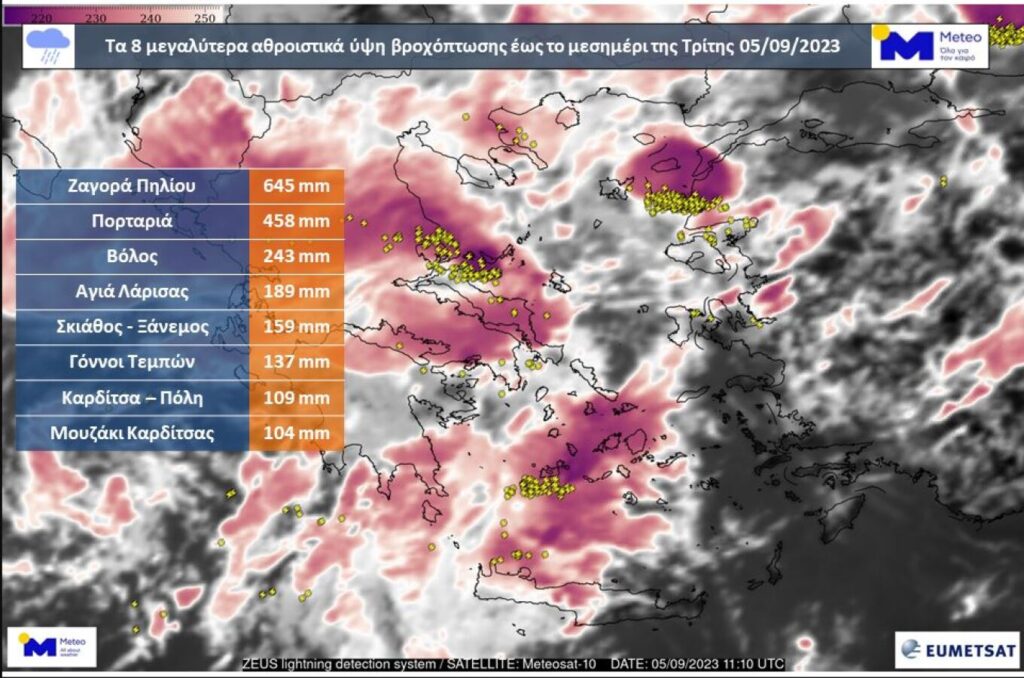 Ξεπέρασε τα 600 χιλιοστά το ύψος βροχής στο Πήλιο την Τρίτη (5/9), ενώ και στην υπόλοιπη Θεσσαλία σημειώθηκαν πολύ μεγάλα ύψη βροχής λόγω της κακοκαιρίας Daniel, σύμφωνα με το Εθνικό Αστεροσκοπείο Αθηνών/ meteo.gr.