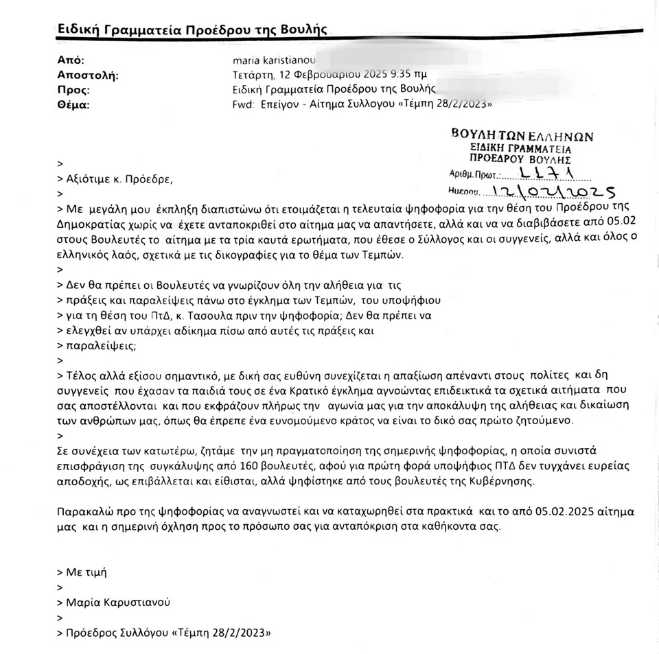 Με μεγάλη μου έκπληξη διαπιστώνω ότι ετοιμάζεται η τελευταία ψηφοφορία για την θέση του Προέδρου της Δημοκρατίας, χωρίς να έχετε ανταποκριθεί στο αίτημά μας να απαντήσετε, αλλά και να διαβιβάσετε από 05.02 στους Βουλευτές το αίτημα με τα τρία καυτά ερωτήματα, που έθεσαν ο Σύλλογος και οι συγγενείς, αλλά και όλος ο ελληνικός λαός, σχετικά με τις δικογραφίες για το θέμα των Τεμπών.