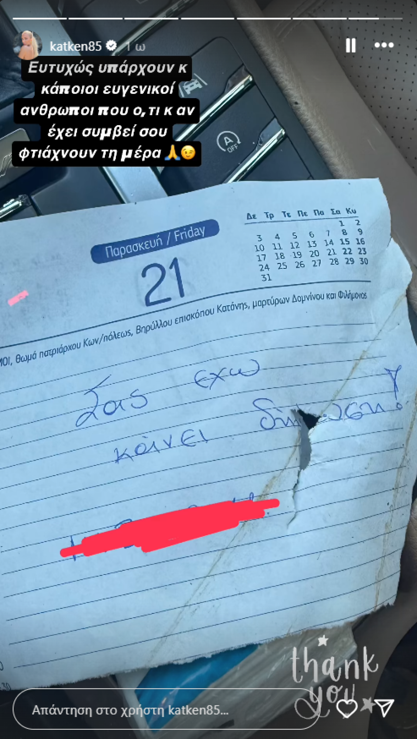 Συγκεκριμένα, «σας έχω κάνει δήλωση», έγραφε το χαρτί που βρήκε η Κατερίνα Καινούργιου στο αμάξι της. Αφού το φωτογράφισε, στη συνέχεια το δημοσίευσε στα social media και σχολίασε θετικά, το γεγονός πως το πρόσωπο που της προκάλεσε τη βλάβη, ανέλαβε την ευθύνη του: «Ευτυχώς υπάρχουν και κάποιοι ευγενικοί άνθρωποι που ό,τι κι αν έχει συμβεί σου φτιάχνουν τη μέρα», σημείωσε η παρουσιάστρια.