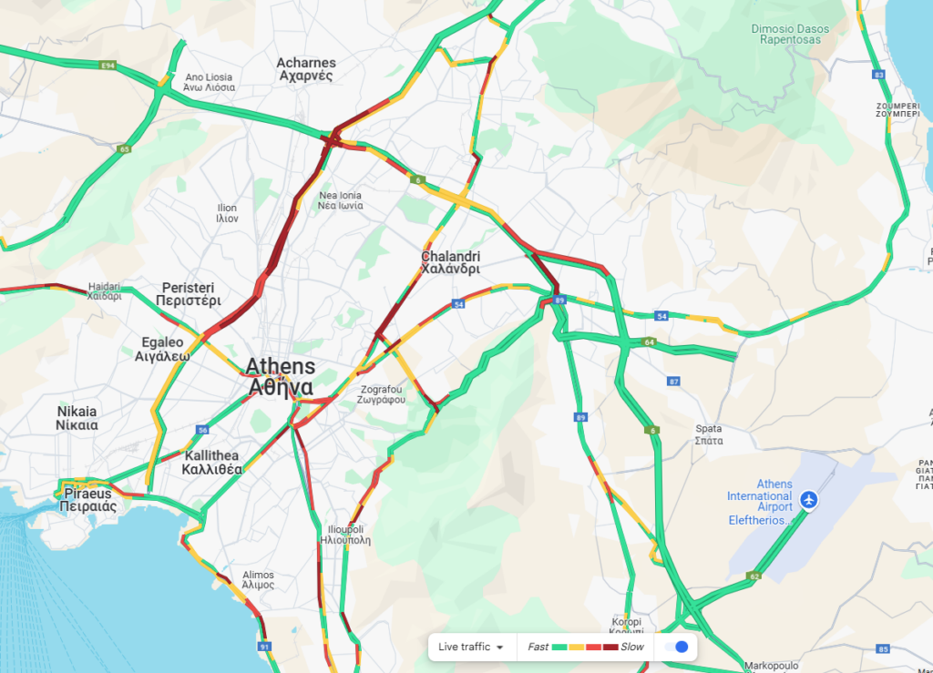 Στην Λεωφόρο Μεσογείων στο ύψος του Χολαργού (όπως φαίνεται και στον χάρτη) είναι λίγο καλύτερα τα πράγματα. Με χαμηλές ταχύτητες κινούνται οι οδηγοί στην Βασιλέως Κωνσταντίνου, στην Βασιλίσσης Αμαλίας, στην λεωφόρο Αλεξάνδρας, στην Βασ. Σοφίας, και στην λεωφόρο Αθηνών.