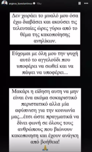 Μακάρι η είδηση αυτή να μην είναι ένα ακόμη σοκαριστικό περιστατικό, αλλά μια αφύπνιση για την κοινωνία μας… έτσι ώστε πραγματικά να δίνει φωνή σε όλους τους ανθρώπους που βιώνουν κακοποίηση και έχουν ανάγκη από βοήθεια», έγραψε στην ανάρτησή του ο Κωνσταντίνος Αργυρός.