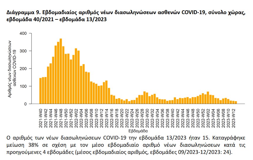 Το σύνολο των νέων εισαγωγών ασθενών στα νοσοκομεία της επικράτειας για COVID–19 την εβδομάδα 13/2023 ήταν 667. Καταγράφηκε μείωση 14% σε σχέση με τον μέσο εβδομαδιαίο αριθμό νέων εισαγωγών κατά τις προηγούμενες 4 εβδομάδες
