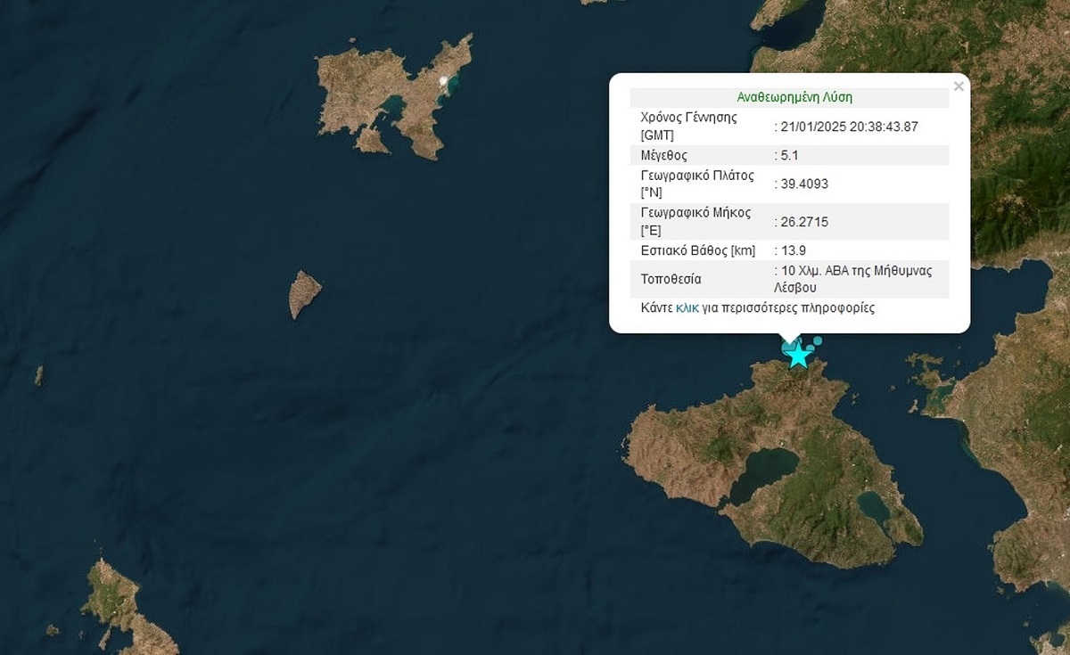 Ισχυρός σεισμός 5,1 βαθμών της κλίμακας Ρίχτερ σημειώθηκε το βράδυ της Τρίτης στη Λέσβο, σύμφωνα με το Γεωδυναμικό Ινστιτούτο. Ο σεισμός σημειώθηκε στις 22:38 το βράδυ 8 χιλιόμετρα βορειοδυτικά της περιοχής Μήθυμνας και είχε εστιακό βάθος 14,6 χιλιομέτρων.
