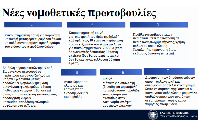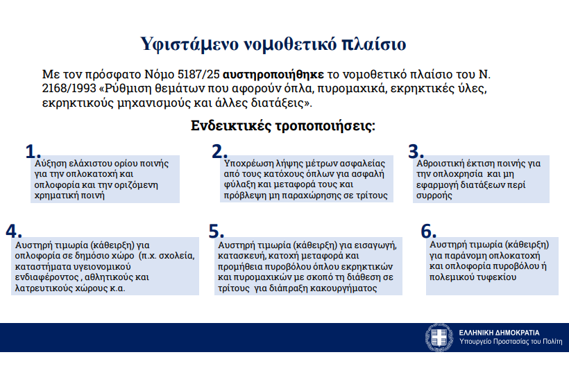 - Κακουργηματική ποινή για παράνομη κατοχή η μεταφορά όπλου για πυροβόλα όπλα με συγκεκριμένη αναφορά για όπλα. Προστίθενται τα πιστόλια και τα περίστροφα.