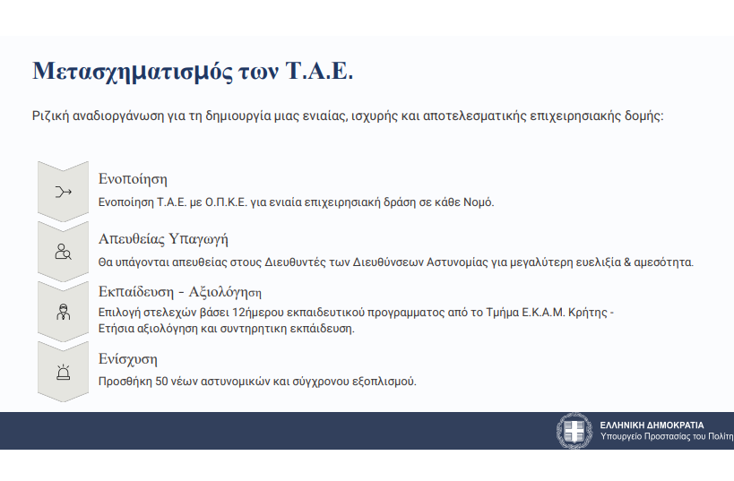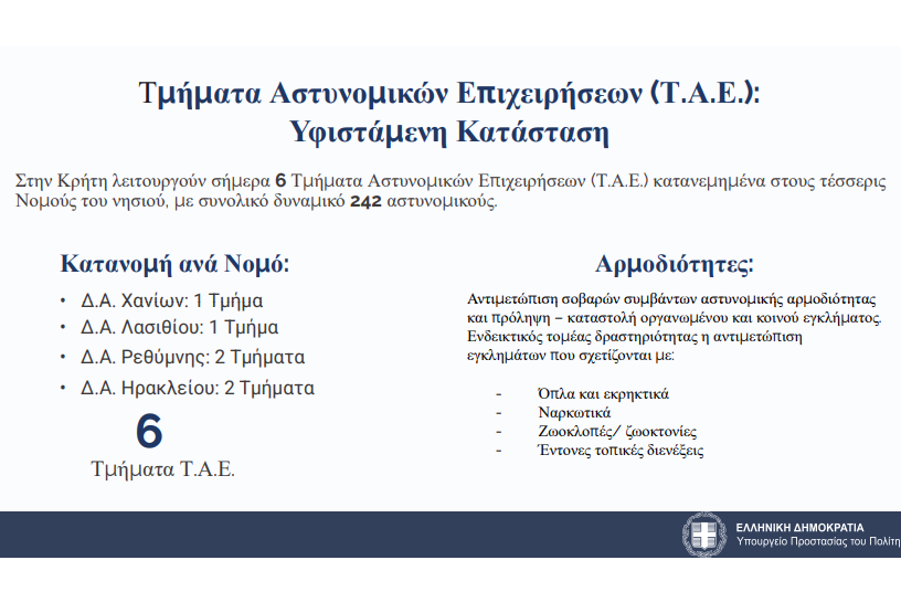 Ανέφερε επίσης ότι συγχωνεύονται τα ΤΑΕ με τις ομάδες ΟΠΚΕ. «Πριν από 25 χρόνια στην Κρήτη ξεκινήσαμε με ίδρυση 6 τμημάτων Τμημάτων Αστυνομικών επιχειρήσεων με συνολικό δυναμικό σήμερα 240 αστυνομικούς. Τώρα προχωράμε στη συγχώνευση των ΤΑΕ με τις ομάδες ΟΠΚΕ και ενισχύουμε τη νέα δομή με 50 νέους αστυνομικούς από την 1η Μαρτίου. Από την ερχόμενη Τρίτη θα είναι εδώ 50 αποσπασμένοι αστυνομικοί για να ενισχύσουν των νέων ΤΑΕ που συγχωνευθούν με τις ομάδες ΟΠΚΕ».