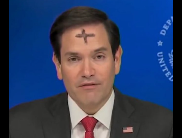 Is the US Secretary of State Marco Rubio spewing Russian propaganda with a giant cross painted in the forehead? pic.twitter.com/1bwtj0hib6