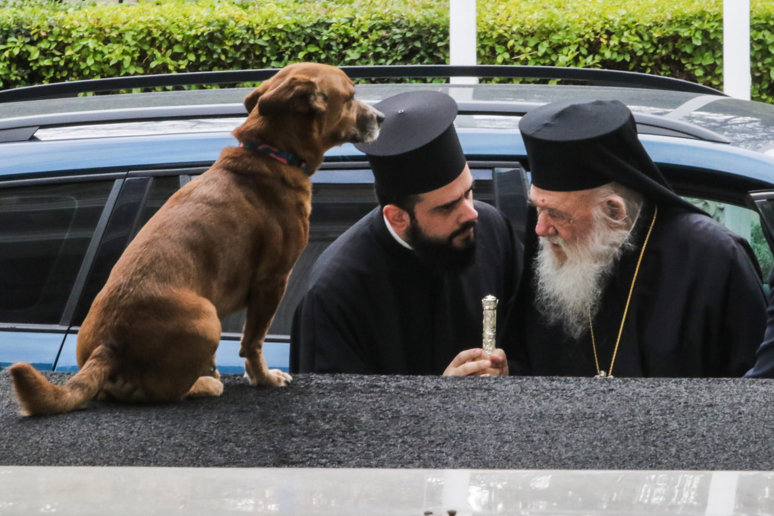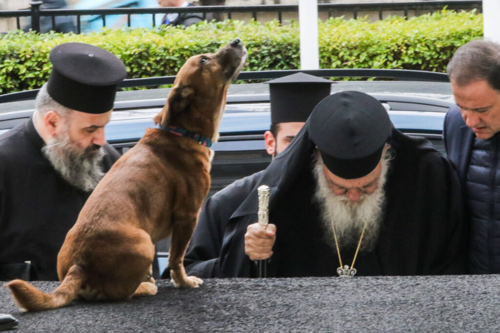 Ο καφές σκυλάκος ένοικος του Μαξίμου ως καλός…. οικοδεσπότης, «υποδέχτηκε» τον Αρχιεπίσκοπο Ιερώνυμο στα σκαλιά του Μεγάρου.