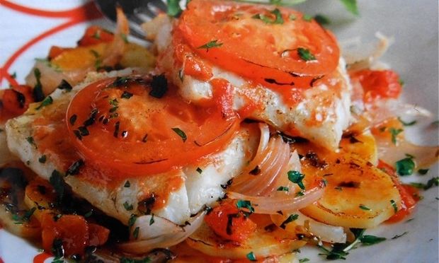 Μία αλλιώτικη συνταγή για το μπακαλιάρο, όπου μπορείτε να τον φτιάξετε με κρεμμυδάκια ξερά, φρέσκια ντοματούλα και πατατούλες στο φούρνο.