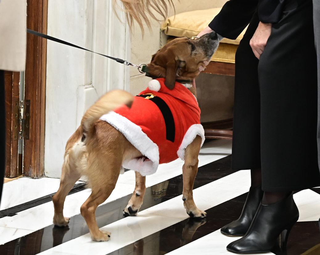 Αυτός που έκλεψε την παράσταση άλλη μια χρονιά, ήταν ο σκύλος του Μεγάρου Μαξίμου, Πίνατ, ο οποίος ήταν ντυμένος Άγιος Βασίλης.