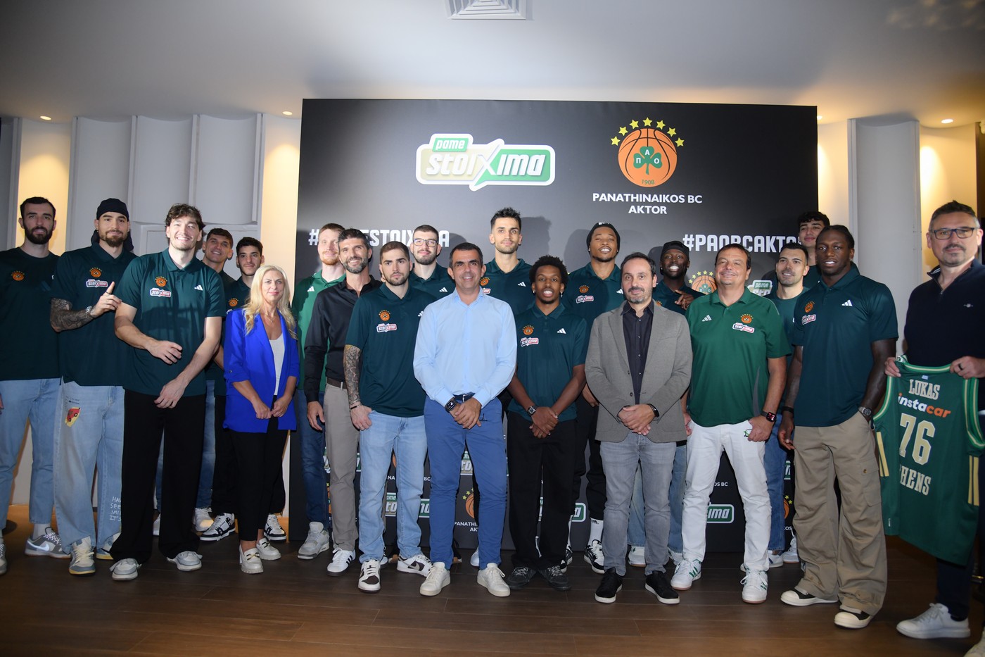 Οι Νίκη Παλάντζα, Pame Stoixima Marketing Community Director, Γιώργος Ζούμας, OPAP Sponsorships Director, Φώτης Ζησιμόπουλος, Chief Sales & Marketing OPAP Stores Officer, Γιάννης Πανόπουλος, OPAP Chief Online Officer και Lukas Antos, OPAP Chief Customer Officer, με τον προπονητή του Παναθηναϊκού AKTOR, Ergin Ataman και τους παίκτες της ομάδας