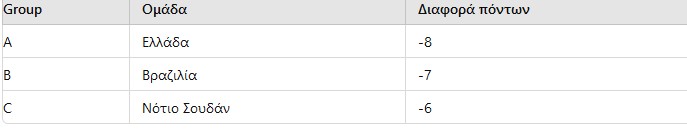 | 2 | Ελλάδα | 3 | 1 | 2 | -8 |