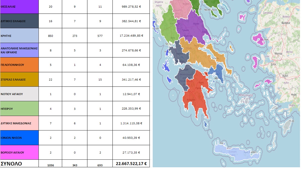 Η Κρήτη σύμφωνα με τον πίνακα των κονδυλίων αναδεικνύεται η απόλυτη «πρωταθλήτρια» καθώς οι δικαιούχοι επιδοτήσεων του ΟΠΕΚΕΠΕ στην περιοχή εισέπραξαν συνολικά 17.234.489,85 €. Ακολουθούν η Δυτική Μακεδονία με 1.314.115,08 € και η Θεσσαλία με 989.278,52 €.