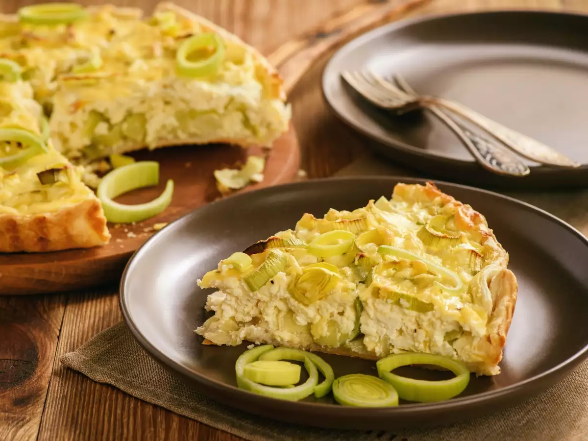 Πώς γίνεται: μαραίνεις στην κατσαρόλα τα πράσα, ανακατεύεις με αυγά/τυρί, στρώνεις φύλλα-γέμιση-φύλλα, ψήνεις μέχρι να ροδίσει.