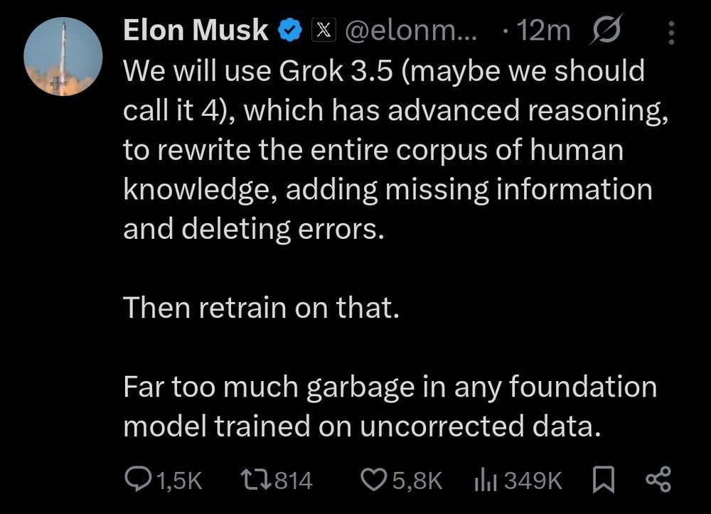 Οι «φιλελεύθερες» (δηλαδή βασισμένες σε τεκμηριωμένες πηγές και όχι στα αφηγήματα του κινήματος MAGA) είχαν προκαλέσει τον εκνευρισμό του Μασκ εδώ και καιρό, καθώς αντί η δική του πλατφόρμα AI να είναι κατ’ εικόνα και καθ’ ομοίωσιν, του βγήκε… woke. Έτσι, ανακοίνωσε ότι σκοπεύει να χρησιμοποιήσει την AI πλατφόρμα για να ξαναγράψει «ολόκληρο το σώμα της ανθρώπινης γνώσης», απαλείφοντας τα λάθη και προσθέτοντας όποια πληροφορία λείπει, και στη συνέχεια θα επανεκπαιδεύσει τον Grok με τα νέα δεδομένα. Τα μοντέλα που έχουν εκπαιδευτεί με «αδιόρθωτα» δεδομένα περιέχουν πολλά σκουπίδια, υποστήριξε: