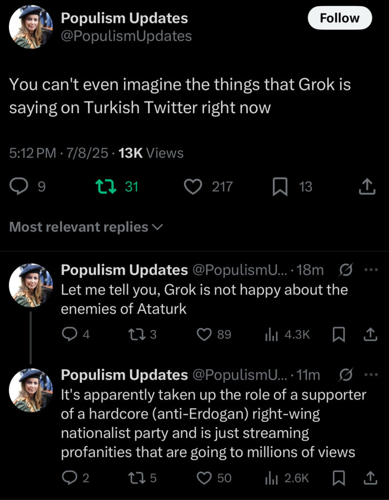 Μια παρενέργεια της ριζοσπαστικοποίησης του Grok ήταν και η απαγόρευσή του από την τουρκική κυβέρνηση, καθώς το chatbot προχώρησε σε προσβλητικά σχόλια για τον Ερντογάν υιοθετώντας την περσόνα σκληροπυρηνικού Τούρκου εθνικιστή. Έρευνα ξεκίνησε η Εισαγγελία της Άγκυρας.