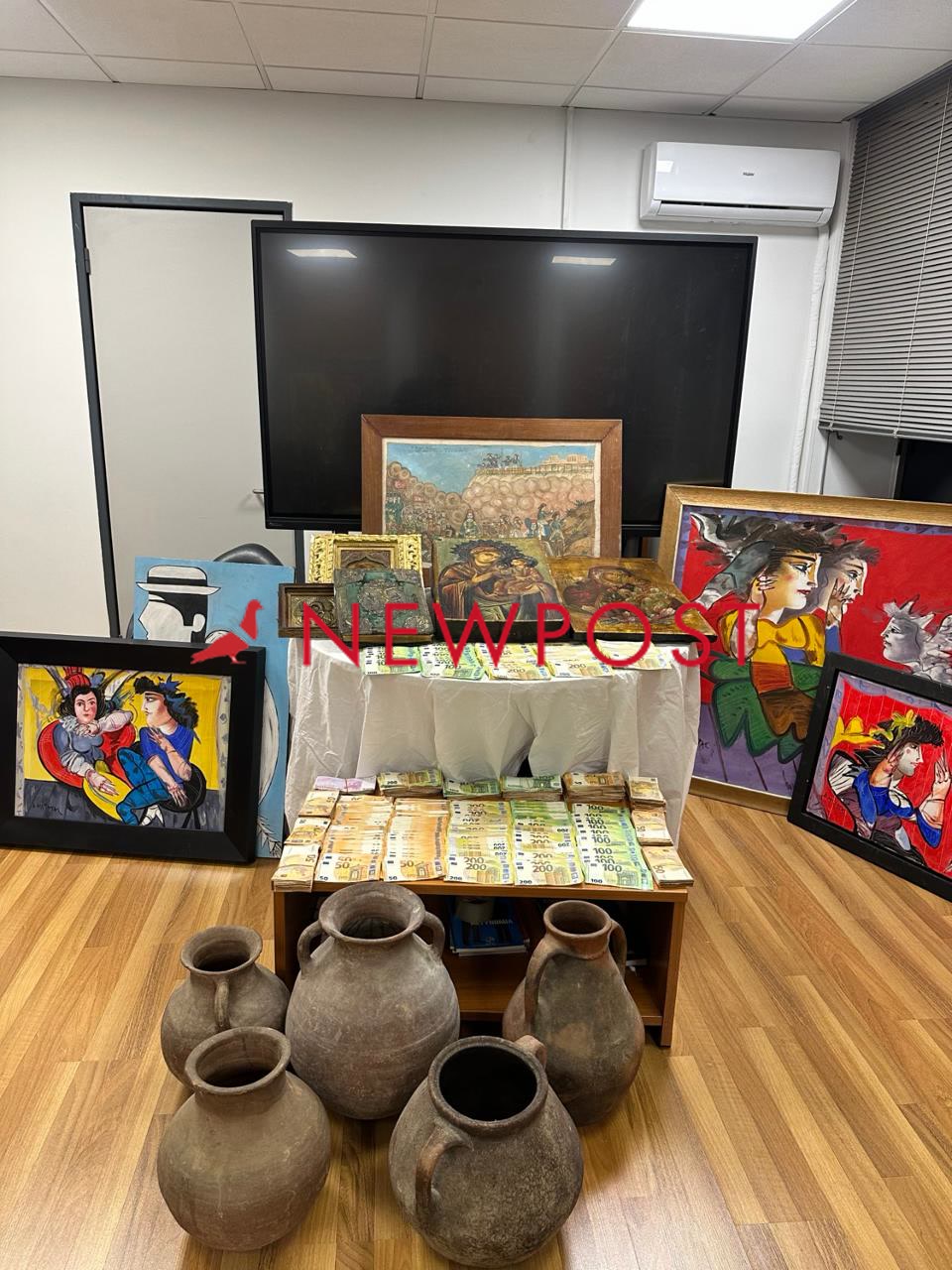 Κατασχέθηκαν 321 έργα τέχνης μαζί με ξύλινες εικόνες, τρεις αρχαίους αμφορείς, αντικείμενα βυζαντινής περιόδου, ψηφιακά μέσα, καθώς και μεγάλα ποσά σε μετρητά.