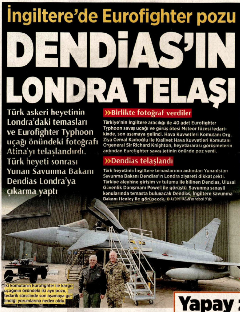 Στο χθεσινό της άρθρο η τουρκική εφημερίδα, αναφέρεται στην επίσκεψη του Διοικητής της Πολεμικής Αεροπορίας Kadıoğlu με τον Διοικητής της Βασιλικής Αεροπορίας Gen αλλά και την αναμνηστική φωτογραφία που έβγαλαν οι δυο άνδρες μπροστά στα Eurofighter. Μάλιστα τονίζει ότι η Τουρκία έφτασε στο τελικό στάδιο της προμήθειας 40 μαχητικών αεροσκαφών Eurofighter Typhoon και πυραύλων Meteor μέσω του Ηνωμένου Βασιλείου. Όπως αναφέρει ενδέχεται να γίνουν αλλαγές στο περιεχόμενο του πακέτου, σχετικά με την προμήθεια 40 F-16 Block 70, 40 F-35 και 40 Eurofighter. Ενδέχεται να υπάρξουν νέες εξελίξεις στην αγορά των F-35.