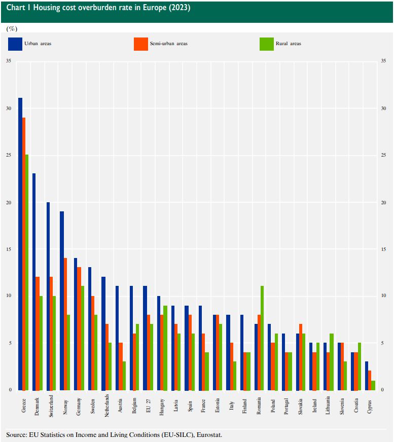 Τα δεδομένα υποδηλώνουν ότι η αύξηση των ενοικίων και των τιμών ενέργειας, σε συνδυασμό με τη χαμηλή συμμετοχή του κράτους στη στήριξη της στέγασης (από τις χαμηλότερες δαπάνες στην ΕΕ το 2022), οδηγούν σε μια ανισόρροπη και μη βιώσιμη κατάσταση.