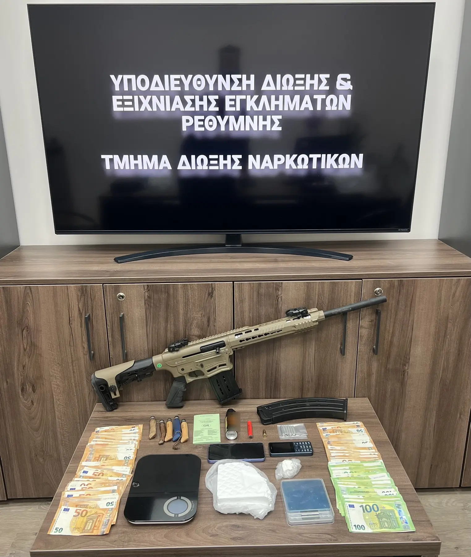 Κατασχέθηκαν μεταξύ άλλων 482 γραμμάρια κοκαΐνης, χρηματικό ποσό 9.000 ευρώ, 6 πυροκροτητές 2 ζυγαριές και όπλο.