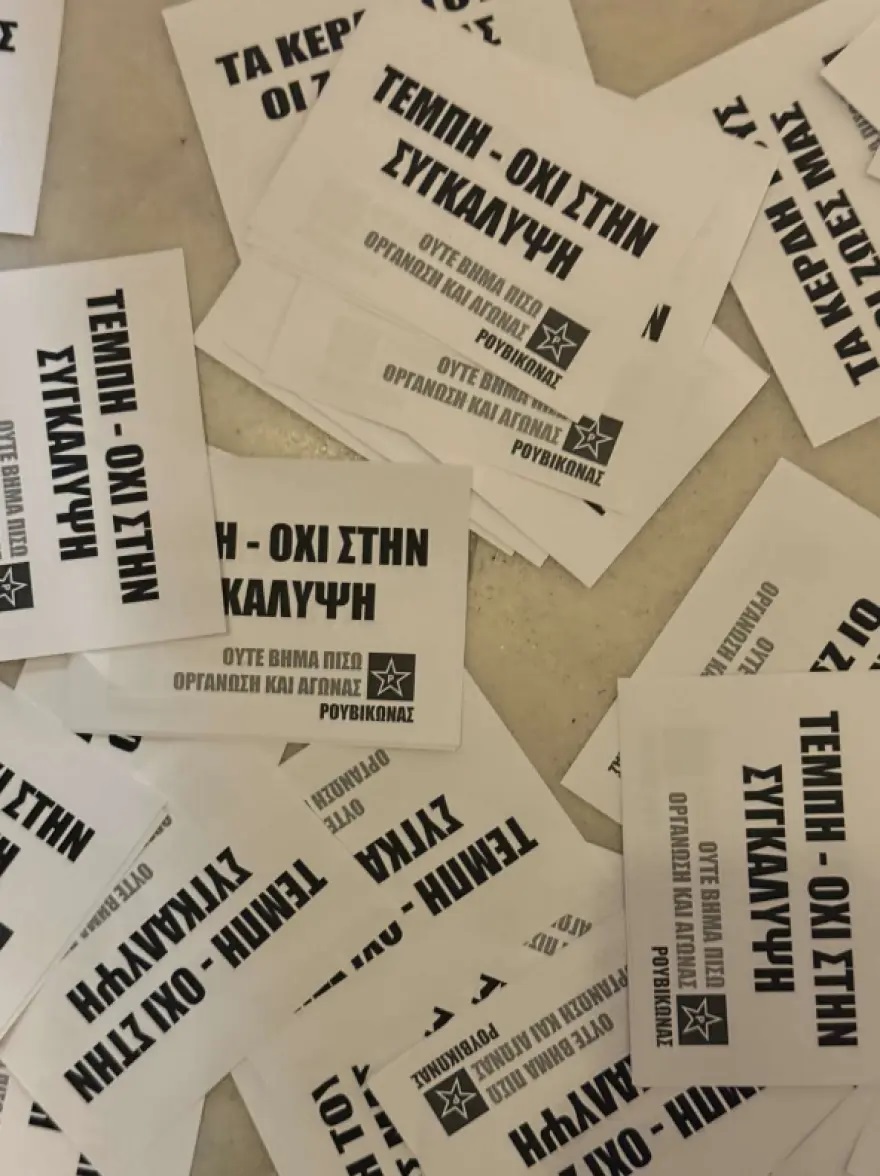 Παρέμβαση με τρικάκια και συνθήματα πραγματοποίησαν μέλη του Ρουβίκωνα στο πολιτικό γραφείο του βουλευτή Α’ Θεσσαλονίκης, Στράτου Σιμόπουλου, ενώ το γραφείο βρισκόταν σε λειτουργία, όπως αναφέρει ο ίδιος σε δελτίο Τύπου. Στις φωτογραφίες που συνοδεύουν την ανακοίνωση διακρίνονται τρικάκια πεταμένα στο πάτωμα με αναφορές στο δυστύχημα των Τεμπών, ενώ σε άλλο σημείο του χώρου έχει γραφτεί με μπογιά το μήνυμα: «Όλοι θα πληρώσετε το αίμα για τα Τέμπη. Ρουβίκωνας».
