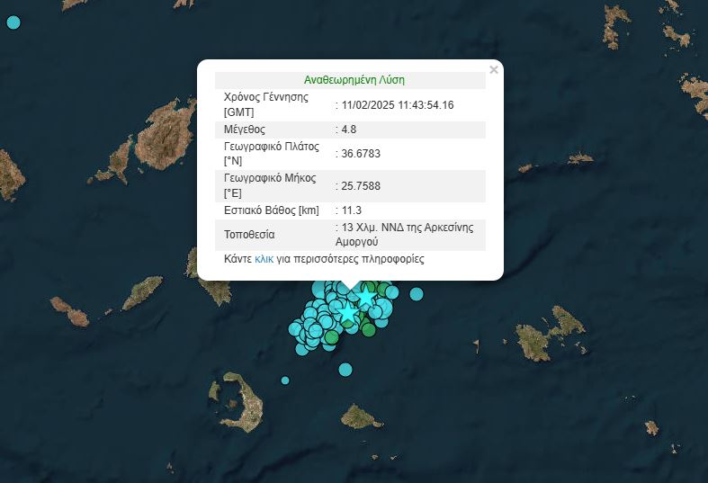 Η σεισμική δόνηση σημειώθηκε 13 χλμ. νοτιοδυτικά της Αρκεσίνης Αμοργού.