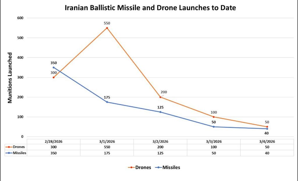 Σύμφωνα με τα διαθέσιμα δεδομένα, στις 28 Φεβρουαρίου 2026 καταγράφηκαν περίπου 300 εκτοξεύσεις drones και 350 βαλλιστικοί πύραυλοι. Την 1η Μαρτίου σημειώθηκε η κορύφωση της δραστηριότητας, με τις εκτοξεύσεις drones να φθάνουν τις 550, ενώ οι πύραυλοι περιορίστηκαν στους 175.