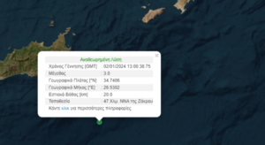 Ο σεισμός των 3 βαθμών της κλίμακας Ρίχτερ έγινε στις 3 το μεσημέρι της Τρίτης 2 Ιανουαρίου και προέρχεται από τον εστιακό χώρο που βρίσκεται νότια της Ζάκρου Λασιθίου.