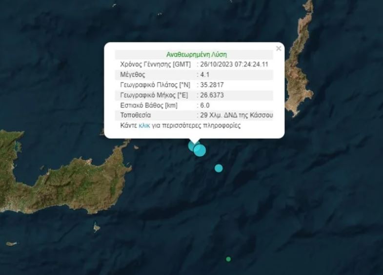 Σεισμός μέγεθος 4.1 στην κλίμακα Richter, σημειώθηκε ανοιχτά της Κάσσου, στις 10:24 σήμερα το πρωί, όπως ανακοίνωσε το Γεωδυναμικό Ινστιτούτο του Εθνικού Αστεροσκοπείου Αθηνών.