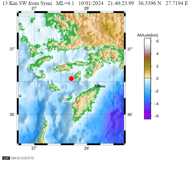 Σεισμός 4,1 βαθμών Ρίχτερ σημειώθηκε στις 11 και 40 σήμερα το βράδυ στην θαλάσσια περιοχή 13 χιλιομέτρων νοτιοδυτικά της Σύμης.