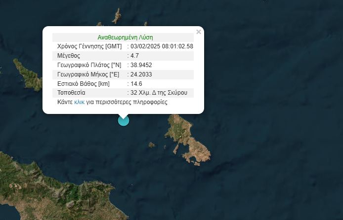 Σεισμός μεγέθους 4,7 Ρίχτερ, σύμφωνα με το Γεωδυναμικό Ινστιτούτο της Αθήνας, σημειώθηκε στη Σκύρο.