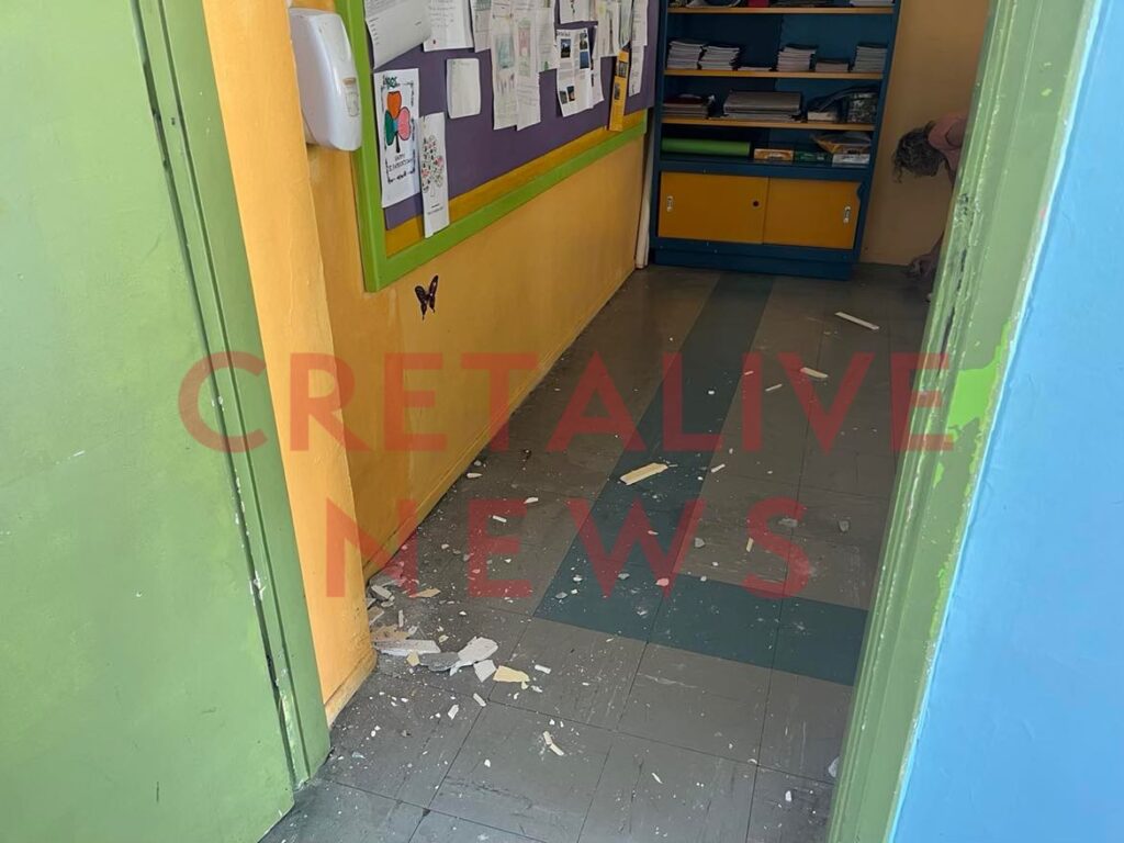 Πάντως όπως είπε στο Cretalive η διευθύντρια του σχολείου πολλές από τις φθορές που καταγράφηκαν προήλθαν από χτυπήματα από τα συνεργεία του Δήμου, που στο πλαίσιο του ελέγχου χτύπησαν τον “σκελετό” του κτιρίου για να διαπιστώσουν τη στατική του επάρκεια.