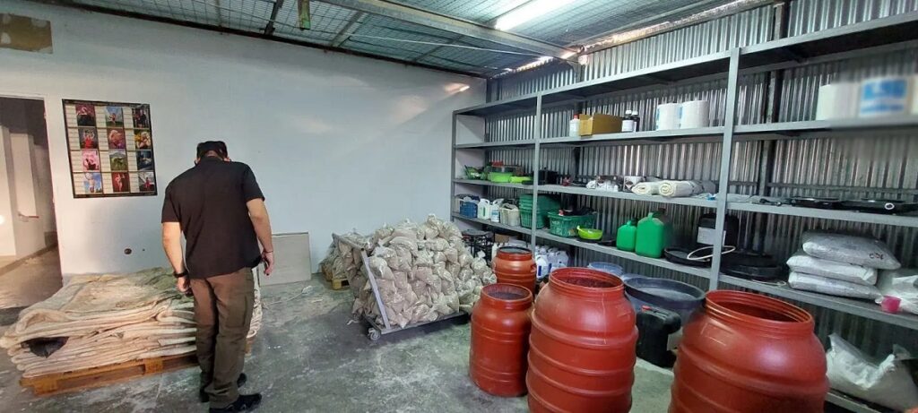 Στον ίδιο χώρο εντοπίστηκε πλήρης εξοπλισμός εργαστηρίου, με εργαλεία και χημικές ουσίες που απαιτούνται για τον διαχωρισμό και τη διύλιση του ναρκωτικού από τα άλατα.