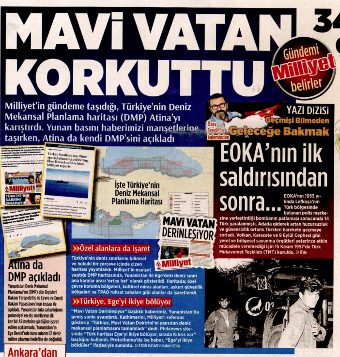 Στην αντεπίθεση πέρασε σήμερα η εφημερίδα Milliyet, με άρθρο στο οποίο απαντά στον θαλάσσιο χωροταξικό χάρτη που παρουσίασε χθες η Ελλάδα. Στο σημερινό της πρωτοσέλιδο με τίτλο «Η Γαλάζια Πατρίδα εκνεύρισε τον γείτονα» η φιλοκυβερνητική εφημερίδα, κάνει μνεία στον ίδιο της τον εαυτό, σημειώνοντας μεταξύ άλλων ότι ο χάρτης με τον θαλάσσιο χωροταξικό χάρτη της Γαλάζιας Πατρίδας που έφερε στο φως, προκάλεσε όχι μόνο την αντίδραση του ελληνικού Τύπου, αλλά ώθησε και την ελληνική κυβέρνηση, να δώσει στην δημοσιότητα για πρώτη φορά τον δικό της χωροταξικό σχεδιασμό.