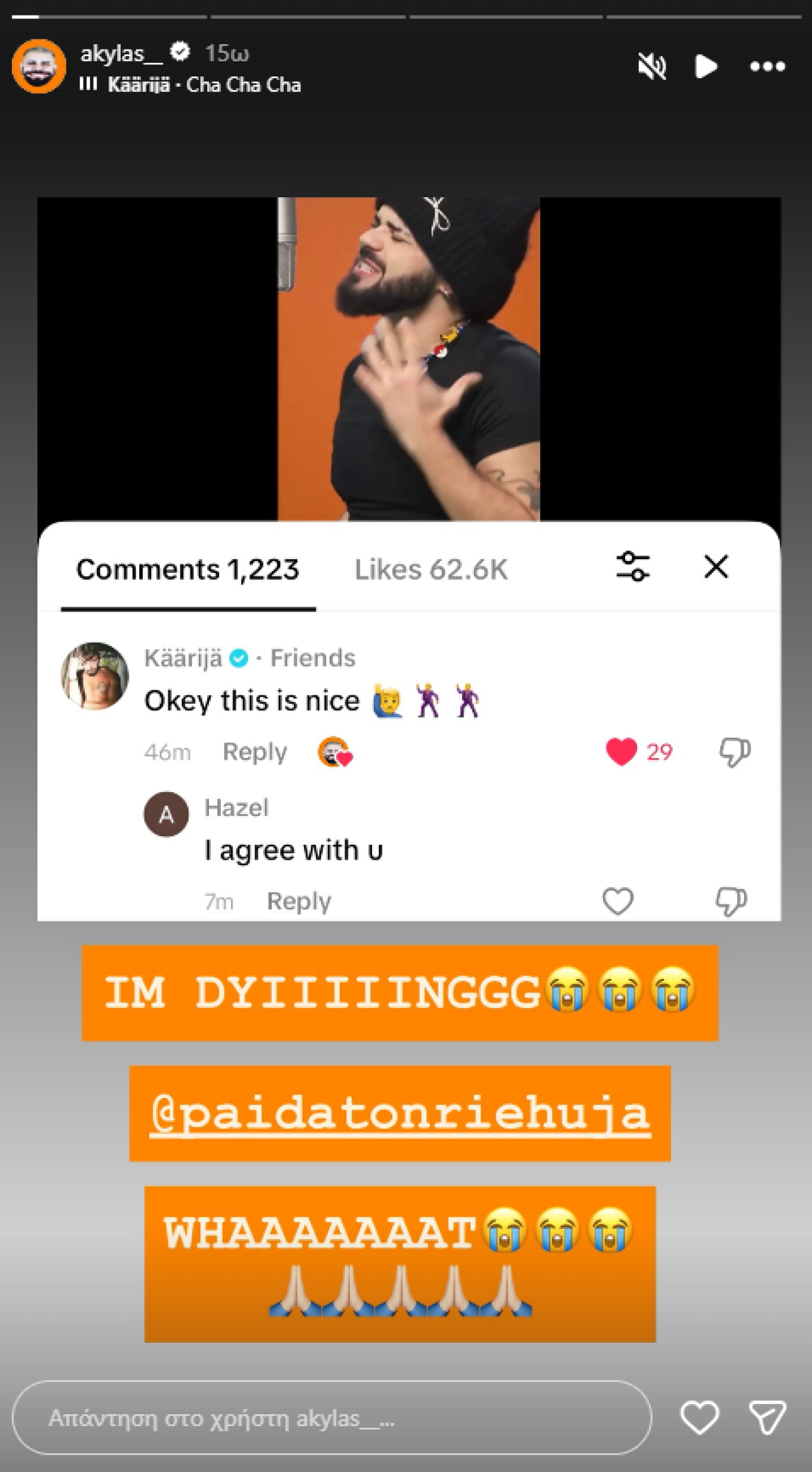 Την Πέμπτη 21 Ιανουαρίου, ο Akylas αναδημοσίευσε το σχόλιο του Käärijä σε Instagram story, γράφοντας χαρακτηριστικά «πεθαίνω», δείχνοντας τον ενθουσιασμό του για την απρόσμενη αυτή στήριξη.