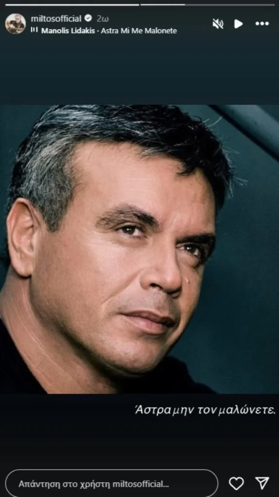 «Έχω να θυμάμαι ιστορίες, Μανώλη… όπως τότε που κατέβαζες το μικρόφωνο, το γύριζες ανάποδα να κοιτάζει στο πάτωμα κι εσύ τραγουδούσες και όλη η αίθουσα άκουγε τη γιγάντια φωνή σου. Πόσες συζητήσεις, πόσα γέλια… Καλό σου ταξίδι, παλικαρά μου», έγραψε στο Instagram.