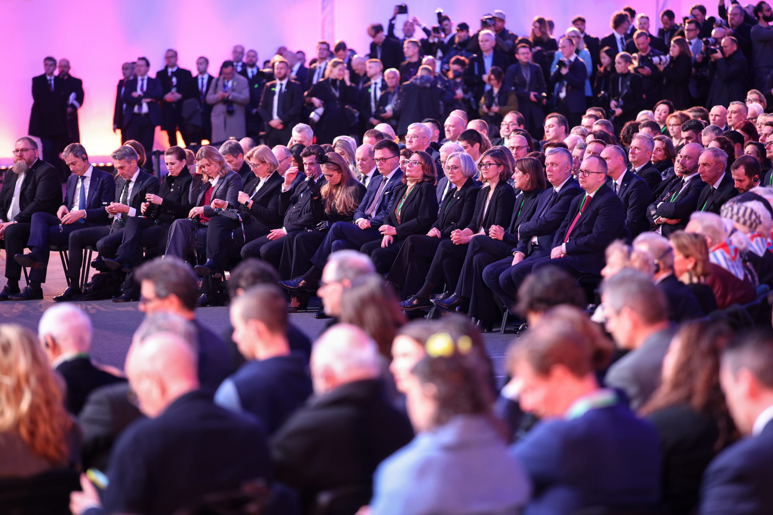Φορώντας κασκόλ με μπλε και λευκές ρίγες, που θύμιζαν τις στολές των κρατουμένων, άναψαν κεριά και απέθεσαν στεφάνια στο «Τείχος του Θανάτου» στο Άουσβιτς, το σημείο όπου χιλιάδες άνθρωποι έχασαν τη ζωή τους.